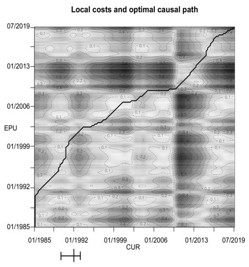 We also take a closer look at the pair yielding the second smallest total distance according to the generalized causality algorithm, namely civilian unemployment rate (CUR) and economic policy uncertainty (EPU). Figure 10 shows the causal path for the two variables. It is salient that the series do not move as smoothly together as GDP and CPI do in the aforementioned case, which is shown by the heterogeneous cost matrix with no clear area of small cost along the diagonal. CUR leads EPU throughout the entire period of time observed, which means that whenever unemployment is high, EPU will rise after some time and vice versa. The size of the lag varies, however, in the way that it becomes smaller over time and is almost zero between approximately the end of 2008 and 2014, before it increases again. There are significant moments to the lead–lag structure in mid-1992 and at the end of 2014. Reasons for this might be the reflation of the economy initiated by former U.S. president Clinton in 1992, which caused unemployment to drop [74] and hence lose its prompt impact on economic policy uncertainty. Furthermore, CUR achieves the lowest value since the beginning of the financial crisis in 2008 (see [75]).