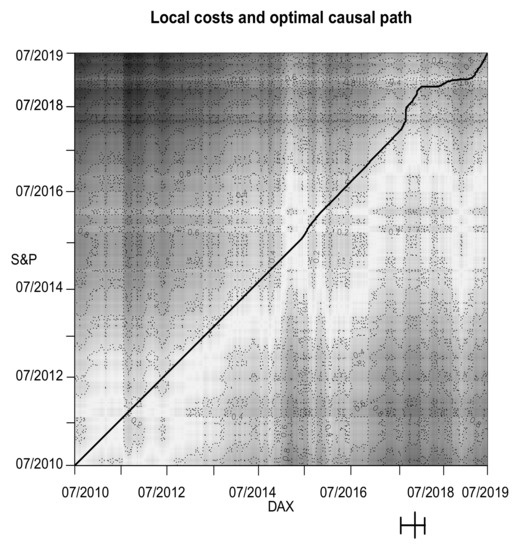 Figure 12 shows the causal path and local costs for the Deutscher Aktienindex (DAX) and the S&P 500 index (S&P). We see that the time series move very well together, with the fact that the representative of the US stock exchange is leading the German counterpart—there are no changes in the lead–lag structure until the end of our observed period of time. Merely the size of the lag increases visibly from the fourth quarter of 2017 onward and shrinks again from mid-2019 onward. Important economic events that might have had an influence on these structural breaks could be the European debt crisis which was still at a peak in 2014 (see [76]). With this in mind, the increase of the lag between S&P and DAX could be caused by the slowly starting recovery of the European economy.