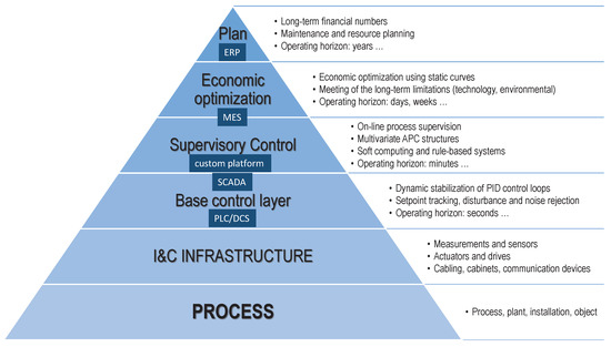 Modern control systems are organized into a hierarchical structure, often presented in the form of a functional pyramid, as shown in Figure 1. The targeted plant of the control system is situated at the bottom. An instrumentation layer is atop the process layer, which enables the upper levels to communicate with the process layer. The regulatory control layer is organized into basic univariate loops that mostly utilize the PID algorithm. This algorithm constitutes a significant majority (>90% or even >95%) of the algorithms utilized [1,2,3]. These percentages might seem strange, but more advanced control techniques, such as Kalman filtering, optimal, robust, predictive, and adaptive algorithms, are only used in a limited number of applications, such as military, expensive processes, nuclear plants, or similar applications. This is a small fraction of the applications compared to civilian industry plants, and the selected MPC applications (even large ones) in the process industry are not comparable to the PID applications, and the applications can be measured in the billions [4]. Moreover, these applications come in the form of supervisory implementations over regulatory PID loops. In such a case, the PID loops are not replaced, but are still used. The majority of control applications are not very complex and not very demanding. Actually, most PID controllers only use the PI elements.