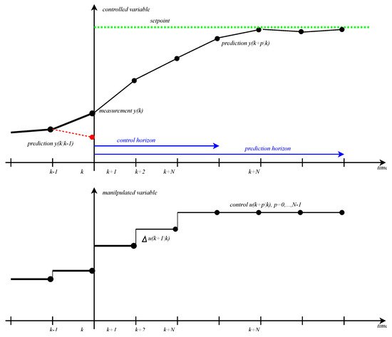 In all MPC algorithms, a dynamic model of the controlled process is used to predict the future values of output variable, , over the prediction horizon, i.e., for . The receding horizon predictive control principle formulated above is presented graphically in Figure 2.