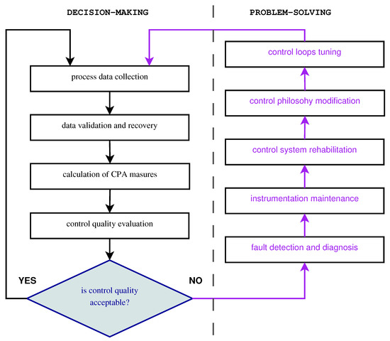 Maintenance performed by plant resources is hardly sufficient. Scientists and practitioners continually try to develop an automatic and autonomous solution that would solve the problem. CPA adventure has started with simple univariate PID-based loop assessment. The first adequate report was proposed by Åström [68] for a pulp and paper plant in 1967 using the benchmarking of process variable standard deviation. Control assessment solutions have evolved for more than 50 years in different direction, delivering to the industry mature approaches, measures, and procedures. There are many different representations of the industrial assessment process. Figure 3 shows generalized diagram of the exemplary CPA industrial utilization process.