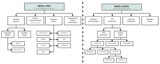One may find a few methods’ classifications in the literature and block tree diagrams visualizing functional similarities and differences. Figure 4 presents graphical diagram of the generalized CPA techniques classification. The industrial perspective simplifies the picture. Simplicity is the main borderline, i.e., the scope of required a priori knowledge for the utilization of a selected approach. Methods that do not require specific knowledge can be simply evaluated by delivering a clear message. In the literature, there exists basic classification, which might be applied to the MPC rule and to the quality assessment as well. Authors distinguish between data-driven and model-based approaches. There are fundamental traps in the popular interpretation of these notions. First, each method uses data. Without data there is no assessment and actually all methods are data driven. Thereby, one might distinguish between model-free and model-based approaches. From that perspective, the majority of techniques are model-based only apart from simple integral or time based. All the statistical approaches are model-based, as evaluated measures originate from some probabilistic density function, which is in fact an assumed statistical model. Thereby, the notion of a model has to be specified. Common understanding is that it is a process model. Consequently, the following classification is used throughout the paper: