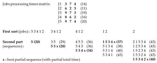 The two points of choice in the NEH heuristic have been clearly highlighted within Algorithm 1 and Figure 2. At the first point, jobs are ranked in decreasing order of processing time, and at the second point, only the best sequences are kept depending on their partial makespan. For the first point, a sorting routine is necessary. Then, depending on which sorting routine is used, the results of the NEH heuristic can differ. For the second point, a choice may have to be made between two equivalent partial schedules; again, the choices can lead to different results. Indeed, they do differ. This difference explains why a large number of studies, in which NEH heuristic results are presented with the well-known Taillard flowshop benchmarks, are different [18,19,20,21]. This is also why observing the different possible orders of Taillard’s benchmarks is of interest. The two improvement methods proposed in this paper are direct consequences of this observation. The first improvement consists of testing the equivalent possibilities in the first sort, and the second consists of testing some equivalent possibilities for the second choice.