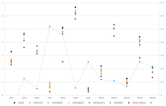The results obtained with the proposed improvement methods, with NEH-SS2 (3), are compared in Table 5 with some recently developed state-of-the-art methods, such as NEH-D [20], NEHKK1 [30], NEHKK2 [31], NEHLJP1 [29], and NEHFF [32]. As can be seen in Table 5, all these methods improve NEH performance compared to Taillard’s benchmark. The new proposed NEH improvement method outperforms all existing methods with an ARPD value of 2.42, achieving the best performances for 11 of the 12 sizes of problems.