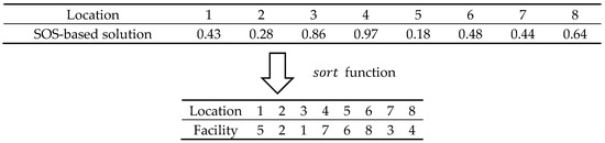 Adopting a proper solution representation of site layout in HSOS-LO for CSLP problem can increase the searching performance. This study employs the solution representation from Zhang et al. [17] that has been proven successful to solve the CSLP problem. It is a general decoding procedure to turn a continuous-based number into a sequence-based value. A layout plan is created based on the values in each index array sorted in ascending order. This solution representation is employed for solving the CSLP problem. The illustration of the solution representation can be seen in Figure 1. There are eight facilities and eight locations. The real-valued SOS-based solution is then transformed into an integer value by using the sort function. The sort function returns the sorted element in the ascending order.
