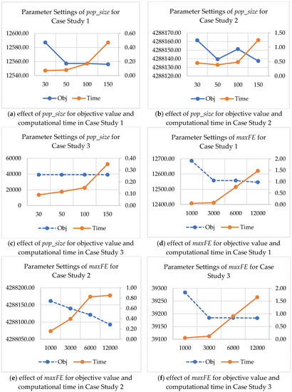 For the parameter setting, each parameter is changed one variable at a time to see the effect on the objective value and computational time. The effect and analysis of the parameter setting can be seen in Figure 2. Take an example of the effect of different pop_size on case study 1, larger pop_size shows a trade-off between objective value and computation time. However, the objective function value of using pop_size equal to 50, 100, and 150 is similar. Therefore, in this case, pop_size equals 50 is selected for case study 1. The same procedure is conducted for the rest of the parameter settings of each algorithm. Finally, the following combinations of parameters were selected in each case study.