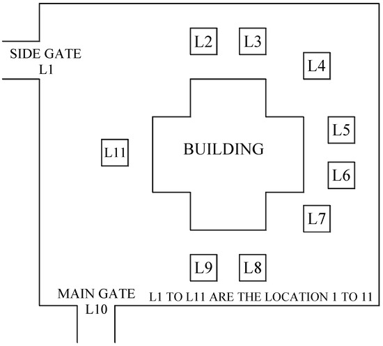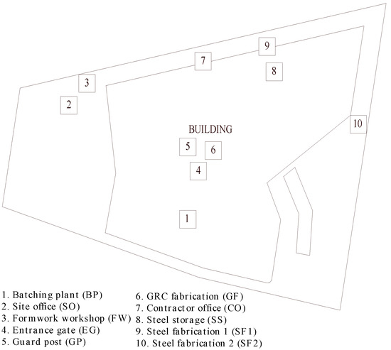 In this case study, the primary objective is to design the temporary construction facilities layout aimed at minimizing the total travelling distance of site workers between different facilities. The site layout has 10 facilities and 10 locations, as can be seen in Figure 8. Entrance gate and guard post are placed permanently at location 4 and 5, respectively, while others are not.