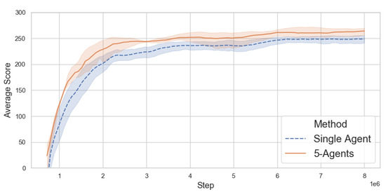 Thus, represents an aggregation strategy where we consider the information provided by each agent as equally important. Moreover, by the linearity of expectations and in view of (3), if we have initial functions with n-step ensemble values , then full updates of each agent will yield for the ensemble. Assume further that learning is done with a single algorithm in separate environments. If we take as estimates of for some step n, with errors distributed as multivariate Gaussian noise, then we should expect to have a smaller expected error variance in its estimation of similar to regression models. This implies more robust performance when given an unstable training process far from convergence, but it also implies diminishing improvements when the algorithm is close to converging to a unique policy.