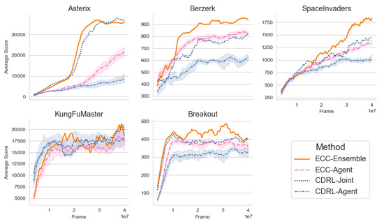 We trained k agents on the first 40 M frames (roughly 185 h of Atari-time at 60 Hz). Agent models were saved every 400 K frames. For each save, we evaluated the performance of the individual agents (ECCagent) and the ensemble with an average joint policy (ECCensemble). Moreover, we took an ensemble of independently trained agents using as our baseline (CDRL joint). For comparison, we also evaluated each such single agent (CDRL agent). In all performance protocols, we started an episode under the 30 no-op regime [17] with an exploration epsilon set to . The evaluation period was 500 K frames with episodes truncated at 108 K frames (30 min).