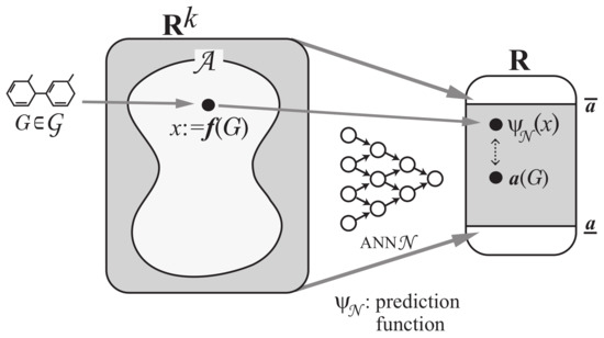 Step 3: Construct a prediction function with an ANN that, given a vector in , returns a real in the range so that takes a value nearly equal to for many chemical graphs in D. See Figure 5 for an illustration of Step 3.