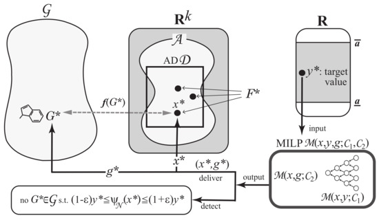 Next we explain how to solve the inverse problem to the prediction in Phase 1 using an MILP formulation. A vector is called admissible if there is a graph such that [18]. Let denote the set of admissible vectors . In this paper, we use the range-based method to define an applicability domain (AD) [24] to our inverse QSAR/QSPR. Set and to be the minimum and maximum values of the j-th descriptor in over all graphs , (where we possibly normalize some descriptors such as , which is normalized with ). Define our AD to be the set of vectors such that for the variable of each j-th descriptor, . As the second phase, we solve (II) Inverse Problem for the inverse QSAR/QSPR by treating the following inference problems.