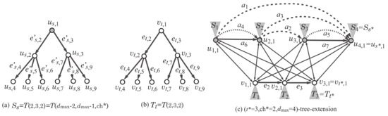 For positive integers and c with , let denote the rooted tree such that the number of children of the root is a, the number of children of each non-root internal vertex is b and the distance from the root to each leaf is c. In the rooted tree , we denote the vertices by () with a breadth-first-search order, and denote the edge between a vertex with and its parent by . For each vertex in , let denote the set of indices j such that is a child of , and denote the index j such that is the parent of when .