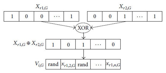 The dichotomous mutation used in [20] will be used in this paper, which is based on the XOR logical operator. The “0” coded bit after applying the XOR operator indicates if any selected two bits are similar; otherwise, the “1” encoded bits represent that the two selected bits are different. According to that arrangement of the feature patterns of a pair of randomly selected solutions, the dichotomous mutation would execute difference operators. Figure 1 illustrates an example of this mutation type. The mutation operator used in our proposed method can be represented as follows: