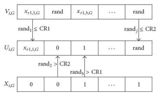 There is a similarity between both mechanisms of the standard DE crossover and the dichotomous one. However, the difference between them is that the dichotomous crossover has two crossover probabilities, while only one crossover probability is used with the standard DE. Considering the jth bit of a trial vector, if there are common bits between xr1,j,G, and xr2,j,G, then Crj and Cr1 are equal. On the other hand, if there are different bits between xr1,j,G and xr2,j,G, then Crj and Cr2 are equal. As shown in Figure 2, the bits of the trial vector resulted from target vector xi, and mutant vector Vi, with difference probabilities of crossover. Figure 2 shows how to conduct the crossover for the first, second, third, and nth bit of Ui, depend on Cr1, Cr2, Cr1, and Cr2, respectively. In Algorithm 1, the above steps of the proposed dichotomous method used for the unsupervised feature selection is shown: