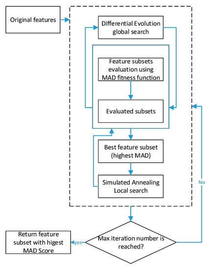 In light of what has been discussed above, it can be summarized that using memetic (hybrid) methods could be more successful than using filter or wrapper methods separately. However, many of the available filter methods used with hybrid methods are not suitable for unsupervised FS due to the necessity of the existence of class labels. As an exception, there are a few examples of unsupervised text filter methods such as the Mean Absolute Distance (MAD) method reported in [11]. A feature relevancy score is assigned by the MAD for every feature by calculating the distance of each feature from the mean of the entire set. The Mean-Median (MM) [12] is also another example of an unsupervised filter. Unlike the MAD, the MM calculates the absolute distance of each feature between the median and mean values. All these methods are capable of local search [11,12,13,14,15,16]. Simulated Annealing (SA), which is a method used to solve optimization problems, simulates the heating of material and then slowly reducing the temperature to decrease the defects, therefore, reduce the system energy. SA can be used for unsupervised feature selection. SA is a metaheuristic method that differs from other methods. It is not a population-based method; instead, it only works on a single solution at a time, and that makes it a good candidate for local search. More recently, a Whale Optimization Algorithm (WOA) was used in combination with the SA in a hybrid wrapper-filter scheme. The WOA was hybridized with SA to improve the quality of the resultant features [17].