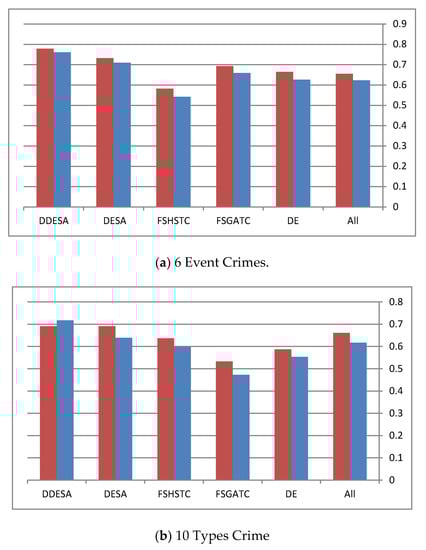 Reuters is one of the widely used benchmark datasets. In this dataset, the values achieved DDESA are comparable with those achieved using the FSGATC method for the maximum. Correspondingly, the ADDC values of the DDESA were less than other methods, including “All” with minimum, maximum, and average values. Finally, with “10 Types of Crimes”, the values of the DDESA are very comparable to other methods in terms of the F-scores and ADDC, including the “All” method.