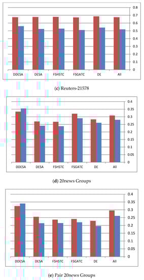 Table 5 lists the total number of original features, the total number of selected features, and the relationship between them. In Table 5, it can be seen that the reduction rates of both the DDESA and DESA methods exceed the ones obtained by other methods. When it comes to the clustering performance after using the DESA FS in both versions, the performance remains at an equal or better level than using “All” features or using other state-of-the-art methods, as shown in Table 4. Furthermore, in Table 5, it can be noticed that DESA and DDESA reduction rates are more than half of the features, ranging between 0.51 and 0.77; the F-scores and the ADDC achieved using the DDESA method are still comparable with the scores achieved by the other methods, including the “All” method. In Figure 4, the red bar refers to the Average F-micro measure while the blue bar refers to the ADDC measure.