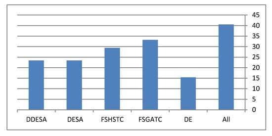 From Figure 5, it becomes clear as a general trend that all hybrid methods take more time than the non-hybrid methods. For instance, the DE is a non-hybrid method and it showed that it takes about half the time needed for the other methods. In contrast, using “All” feature would lead to an increase in the execution time, which means unnecessary features are used. When it comes to our proposed method, the DDESA, it showed that its time consumption is less than the other hybrid methods used in the tests. However, as for future work, enhancements might be made to reduce further the time taken by our proposed method.
