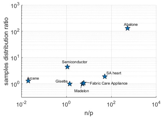 To test the abilities of RVM and LASSO with respect to discovering the true model structure and predicting the correct class, we consider both real and simulated data sets. These datasets consist of binary output values, i.e., , present different characteristics in terms of p and n values and have different ratios between the number of samples belonging to the different classes. A summary of these characteristics for the real datasets are presented in Table 1 and Figure 1 while the simulated datasets are described in the following subsection.