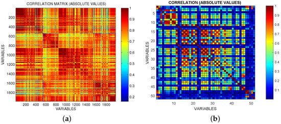 Figure 2. Absolute value of the correlation matrix for the semiconductor dataset (OES data) (a) and Fabric Care Appliance dataset: (b).