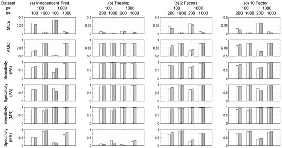 - Data set (d) is identical to (c) but with 10 instead of two factors;