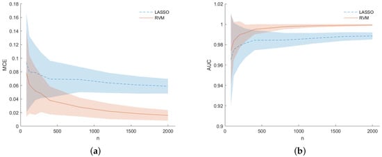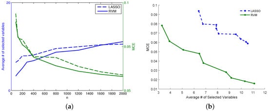 Here, we compare the LASSO and RVM implementations for the estimation of a linear logistic regression model for classification tasks. The prediction accuracy and model recovery performance of each approach is investigated for both simulated and real benchmark datasets. Comparisons are performed within a Monte Carlo Cross-Validation framework to increase the robustness of the analysis. Many advanced solvers are available in the literature for logistic regression problem; for example, refs. [16,17] provide efficient procedures to solve related optimization tasks. There are several works dealing with the comparison of different algorithms for estimation of models with norm regularization, see for example [18,19], however, to the best of our knowledge, very few works in the literature provide a broad comparison on several datasets with different characteristics between LASSO and the RVM (see Section 2 for details on related work on the comparison between LASSO and RVM as well as other related methods for regularization). Moreover, an element of novelty provided by the present work, is the application of RVM and LASSO comparing them not only in terms of prediction accuracy but also in terms of structure recovery capacity on real industrial datasets, one related to a semiconductor manufacturing modeling problem referred to as Virtual Metrology and the other related to consumer goods soft sensing problem provided by Electrolux.