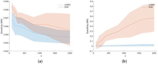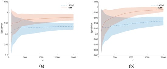 Free available software implementations were used for Simulations (Matlab libraries: glmnet (http://www.stanford.edu/~hastie/glmnet_matlab/) for LASSO and Sparse Bayesian Modeling (http://www.miketipping.com/sparsebayes.htm) for RVM). In all simulations, the percentage of data used for training is with a cycle of iterations for MCCV and an inner cycle of iterations for K-fold as explained in Section 4.1. As regards the choice for thresholds related to the RVM hyperparameters introduced before in Section 3.2, default numerical values available in the library have been taken into account and reported here: