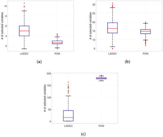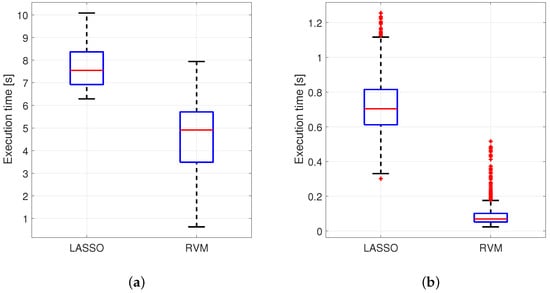 Figure 10 shows distributions of the execution times obtained for each MCCV iteration for each method. The elapsed time for each execution was measured by using tic-toc command available in MATLAB. This couple of instructions was used to tag the beginning and the end of the key code for each method so that the difference in time between the two tags indicates the desired execution time. More specifically, the tic function records the current time, and the toc function uses the recorded value to calculate the elapsed time (source: https://www.mathworks.com/help/matlab/ref/tic.html). The main steps related to the implementation of the two procedures have been summarized in Table 5 for the sake of clarity. These steps affect the execution time and are useful to stress the methodological differences between the two strategies as well. As the reader can notice, only LASSO performs the choice of the optimal regularization parameter with a dedicated inner procedure that turns out to be particularly demanding considering the entire set of iterations. On the other hand, RVM determines the model complexity automatically by the data through ARD as already stated in Section 3.2.