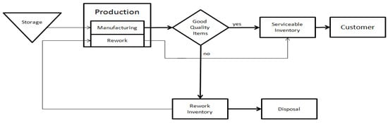 The GLSP-RP was introduced by [] to model process environments where conflicting items are required to avoid contact as they are subject to contamination, for example, the food processing industry where an-allergenic food items are produced on the same machine as regular food items. The problem considers an imperfect production system where a fraction of the planned lot size is not of serviceable quality and goes to a separate rework inventory where it is stored till it is reworked and shipped to customers or disposed of, which is illustrated in Figure 1.