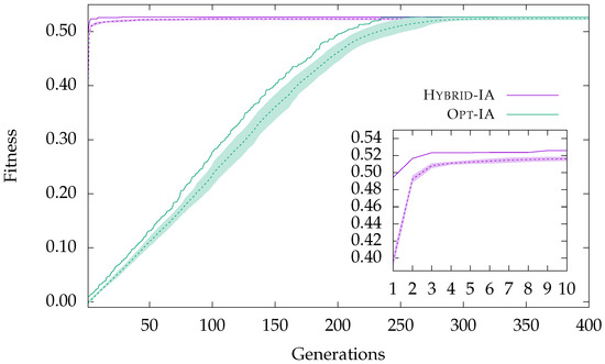 Moreover, the m and parameters in Opt-IA have been set to 1 and , respectively; however, for Hybrid-IA, and have been set to and 5. Note that all parameters of Opt-IA have been determined through careful tuning experiments, whilst those of Hybrid-IA have been identified both from the knowledge learned by previous works [11,12], and from a preliminary and not in-depth experiments. As described above, the maximum number of generations has been taken into account as stopping criterion. For all experiments performed in this research work, it was fixed for Opt-IA, and for Hybrid-IA. Note that a higher iterations number has been considered for Opt-IA due to its blind search, which, for obvious reasons, requires larger time steps to reach acceptable solutions.