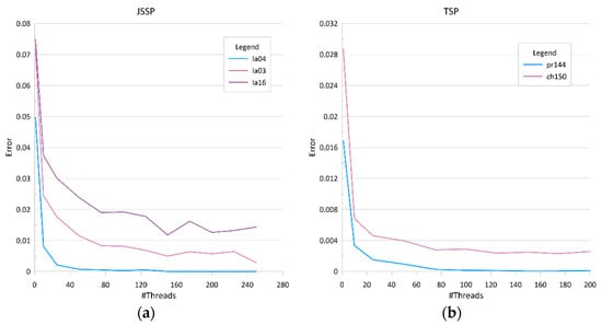 Mean error versus the number of threads for some example (a) traveling salesman (TSP) and (b) job-shop scheduling (JSSP) datasets.