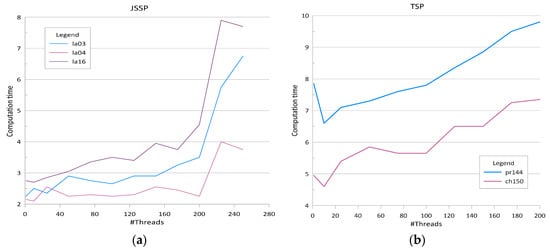 Mean computation time (s) versus the number of threads for some example (a) TSP and (b) JSSP datasets.