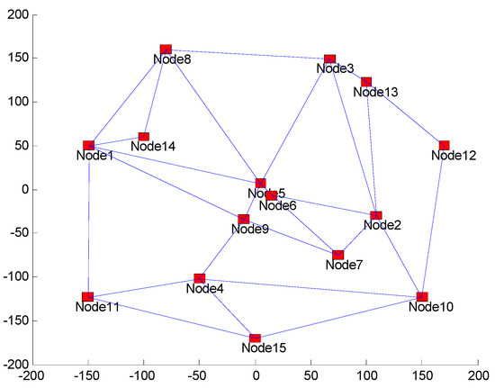 In this simulation, we added five nodes, as follows. Nodes 11, 12, 13, 14, and 15 are located at (−150 m, −123 m), (170 m, 50 m), (100 m, 123 m), (−100 m, 60 m), and (0 m, −170 m), respectively. Moreover, four edges configurations in the new graph were established, called CONFIG 15-1, CONFIG 15-2, CONFIG 15-3, and CONFIG 15-4. The CONFIG 15-1 connectivity configuration is described in Figure 4. CONFIG 15-2 is constructed by adding an edge connecting Nodes 1 and 5 on the CONFIG 15-1. The CONFIG 15-3 configuration is performed by adding edges connecting Nodes 1 to 4, 2 to 12, and 7 to 10 to CONFIG 15-2. The CONFIG 15-4 configuration is performed by adding edges connecting nodes 4 to 7 and 3 to 6 to CONFIG 15-3. The degree of each edge in each connectivity configuration is described in Table 4.