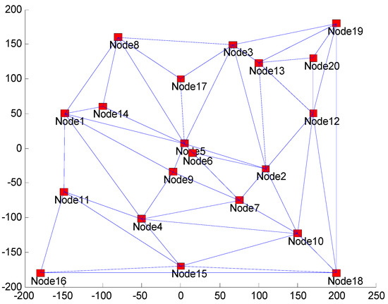 In this simulation, we added five nodes from the CONFIG 15-1, as follows. Nodes 16, 17, 18, 19, and 20 are located at (−100 m, −180 m), (0 m, 100 m), (200 m, −180 m), (200 m, 180 m), and (170 m, 130 m), respectively. Similar to the simulation for 15 nodes, we define four edge configurations in the new graph, namely CONFIG 20-1, CONFIG 20-2, CONFIG 20-3, and CONFIG 20-4. The CONFIG 20-1 connectivity configuration is described in Figure 5. CONFIG 20-2 is constructed by modifying CONFIG 20-1, i.e., adding edges connecting Nodes 1 to 16, 4 to 16, 2 to 20, 6 to 9, 8 to 19, and 12 to 17. CONFIG 20-3 is performed by adding Edges 2 to 17, 3 to 5 to 9, 7 to 15, and 9 to 15 and eliminating Edges 4 to 16, 4 to 10, and 14 to 17 on CONFIG 20-2. CONFIG 20-4 is performed by the addition of Edges 3 to 17, 4 to 16, 4 to 10, and 5 to 14 to CONFIG 20-3.