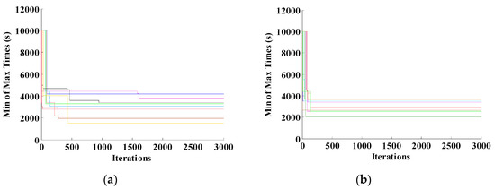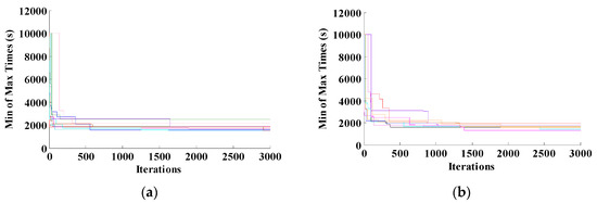 Figure 6 and Figure 7 show the searching progression for s and s, respectively, each with and . It can be concluded that the algorithm’s ability to converge is better for s than for s. It can be concluded from the final values until the 3000th iteration. Moreover, Figure 6 and Figure 7 confirm the accuracy conclusions conducted from the statistical correlation analysis. Accuracy analysis can infer other behavior, that is, the ability to reach . Figure 7 shows that, for s, the algorithm’s ability to reach is better than that for s. Furthermore, it can be seen that, for s, even until the 1500th iteration, the algorithm still can update the minimum of maximum times. However, it cannot go further to . The interesting situation occurs for in the same . In this situation, mostly, once a solution is found, the algorithm cannot find another better solution.