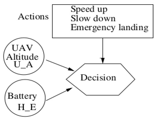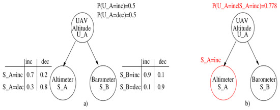 BNs are probabilistic graphical models used to understand and control the behavior of systems [19]. The nodes of such a network represent random variables, the conditional probabilities of which are given by probability tables (CPTs). The arcs of the network indicate the conditional dependencies. The structure of the Bayesian network is defined by the nodes and the arcs of the corresponding graph. The parameters of the BN are the CPT of the nodes. A simple example of a BN is given in Figure 1. The node UAV Altitude () represents the altitude status describing whether the altitude of the UAV is increasing or decreasing. The nodes Barometer () and Altimeter () represent the sensors observing whether the UAV moves up or down. The node influences the sensor readings, hence there are arcs from to and . The CPT tables for the sensor (), for example, should be read as follows: if the status is “increasing”, then the probability that it is reading an increasing value is .