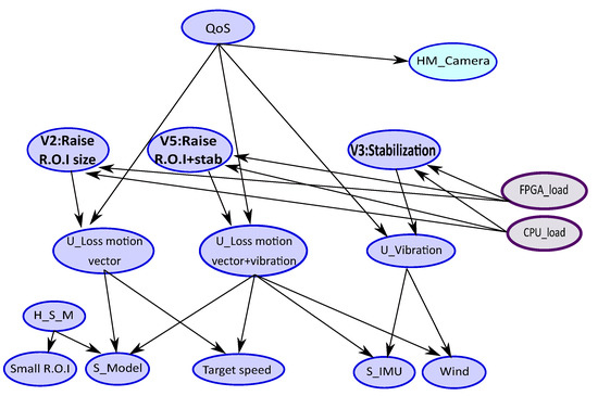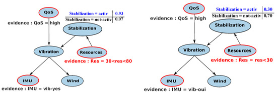 BN can also help to mitigate error by proposing the most adequate solution when an error is detected. In this case, the BN includes the potential mitigation proposal. We fix the expected resultant and we calculate by inference the most adequate solution to solve the problem. To ensure the quality of service of the application, some error recovery can be activated. In that case, if we activate the stabilization, the QoS of the application increases. To know if it is useful to activate the stabilization, we can proceed by inference. We evaluate the probability to activate the stabilization by fixing the quality of service at high. If this probability is high that means that the most appropriate action is to activate the stabilization in order to increase the QoS. This principle is illustrated in Figure 4.