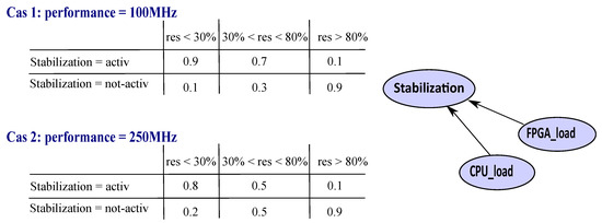 The timing constraints can be inserted also in the BN model, connected to the resource information. Actually, the resource needed for the application implementation can increase to provide an application with a better performance because parallel functions need generally more resource to operate in a parallel way. This can be modeled with the parameters of the BN model as shown in Figure 7. To operate at 250 MHz, we need more resources (>30%) than if we operate at 100 MHz.