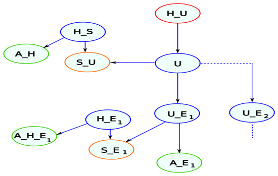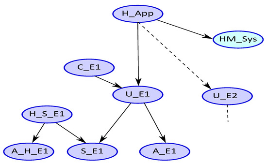Failure mode and effects analysis (FMEA)_Health Management (HM) pattern for BN where the , nodes represent the sensor nodes of either a hardware or a software monitor, the nodes U, are the internal states possibly affected by an error , the node represents the health of the system, and nodes represent the health of the sensor and the , are the appearance contexts.