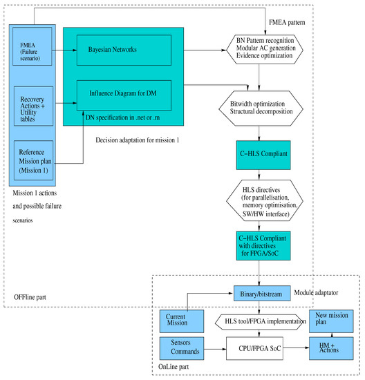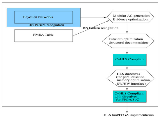 For an efficient implementation of the diagnosis and the mitigation modules specified by Bayesian Networks from FMEA tables, we propose to target FPGA support. The different steps to generate an efficient bitstream are detailed in Figure 11. The main steps are: