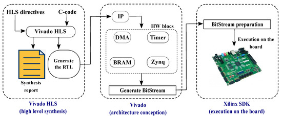 Figure 12. Integration of our proposal to Xilinx Design flow: HLS directive adaptation, C-code generated by our tool proposal, adaptation with the architecture option (BRAM, DMA).