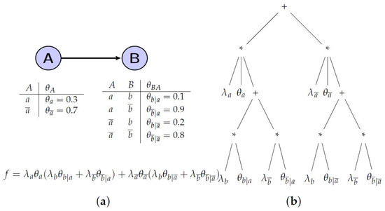 (a) A simple BN represented by a multilinear function f. (b) The corresponding Arithmetic Circuit of the BN.