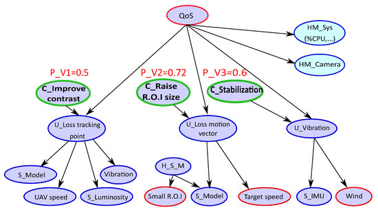 During UAV missions, the evaluation of health status of the components of the system (i.e., sensors, actuators, etc.) is done from sensor data [20]. On the other hand, the Quality of Service (QoS) status of the applications which are executed on board, such as tracking application, can also be monitored to ensure mission success. Figure 2 illustrates the monitoring of the tracking application. For this application, we enumerate the different potential problems that can occur. In this example, one of potential problem is the vibration that can affect the quality of the tracking. The vibration can occur when IMU shows deviation or when strong wind is detected. This BN evaluates the QoS of the application based on evidence on IMU deviation or on wind detection as described in Figure 3.