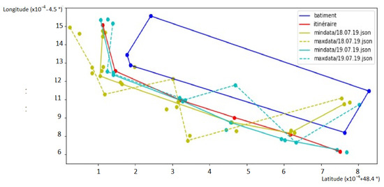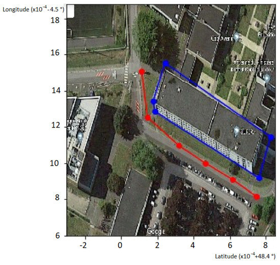 Once the database of the observed data for each node is built, we can perform the EM algorithm to learn the BN parameters which is the CPT probability values. The idea here is to compare the accuracy of the GPS position obtained with different collected database, with the reference one. Figure 26 shows the reference path (known position in red) around a building. Figure 27 shows the different paths (resulting from GPS positions) obtained by applying EM with different databases built from he collected data. In comparison with the reference path (in red on the figure), we can show that the accuracy of the GPS position varies according to the variation of the collected raw data and the rate of missing values in the database. In this case study, the parameters of all the BN nodes are learned with EM algorithm. The complexity of this approach varies according to the number of nodes and the conditional dependence. To deal with this, we can just learn the parameters of the pertinent nodes like the sensors nodes and the appearance context nodes using EM with another kind of inference mechanism [39].