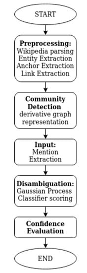 As a next preprocessing step, we employ either Louvain or Clauset–Newman–Moore algorithm community detection on the Wikipedia Entity graph to achieve segmentation based on Wikipedia Entity community coherence characteristics. Hence, leveraging the ensured concept consistency, we manage to focus on a strict subset of Wikipedia Entities and thus improve the overall disambiguation efficiency by substantially demoting unmeaningful context from the collective mention consensus. Even if the computational complexity of these algorithms is O(n log2n), as outlined in [,] both algorithms’ performance was evaluated in the context of the problem.
