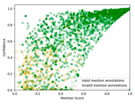 The Mention Score—Confidence scatterplot (Figure 2), outlines the correlation of the confidence score with the probability of a valid mention annotation as intuitively anticipated. As we model confidence, based on the relative difference of the next highest positive linking probability estimated mention, we can observe a proportionately insignificant number of invalid mention annotation outliers for some relatively high confidence scores. The generated GPC model, which considers community coherence, link probability, average Jaccard index of inter-wiki links, and average relatedness [], yields impressive accuracy performance. Specifically, the proportion of the valid versus the invalid annotations appears highly inclined towards the valid annotations.