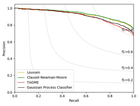 Precision-recall of the two community detection methodology variants, the Gaussian Process Classifier and TAGME [] baseline.