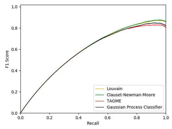 In Figure 4, we observe the peak of F1 score near the 90% mark on the recall axis. Overall, the Clauset–Newman–Moore methodology attains consistently supreme performance, as clearly depicted towards the rightmost part of the recall axis. The nearly impeccable accuracy of our methodology, even at high recall, outlines the value of our approach to the problem, along with the substantially beneficial impact of introducing community coherence as structure interpretation of contextual resemblance in a highly variant collection of documents at a big-data scale.