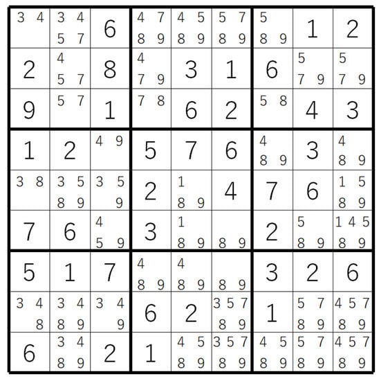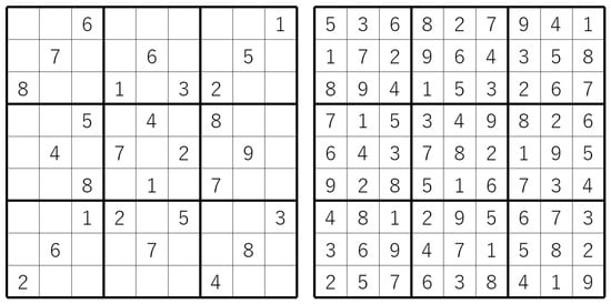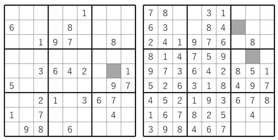 Regarding 1, for example, the left grid of Figure 1 has reflection symmetry on the two diagonal axes. It may also have the shape of a number, a letter, or a symbol. Regarding 2, completing Sudokus generally requires backtracking, which is amenable to computers. On the other hand, there is a set of techniques (called strategies) that humans use in solving Sudokus by hand []. Typically strategies are if-then rules: If a strategy is applicable to the current grid, then it might rule out digits as candidates or might determine digits as those to be finally placed. A strategy-solvable Sudoku is a partially completed grid that can be completed by applying strategies repeatedly. Here, the strategies must be selected from a set of predetermined ones. Since there is no need to guess, strategy-solvable Sudokus (at least for a few basic strategies) might be referred to as Sudokus having a moderate level of difficulty for humans.