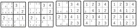 A state is an initial state if it satisfies the following: for all clue cells; for the other cells; and if and only if the antecedent of holds. The last condition ensures that for each clue cell, all digits but the determined one are ruled out; all digits that appear as candidates in a common group to some determined digit are ruled out; and—the only-if part—no other digits are ruled out. Notice that the only-if part is the most essential because the if part can be omitted thanks to . It is worth noting, that for non-initial states, this must not be assumed in general because of strategies for number removals such as locked candidates. For example, in the-left most grid of Figure 5, we can observe that all digits not designated to be ruled out by the antecedent of remain as candidates. We denote by I the set of all initial states.